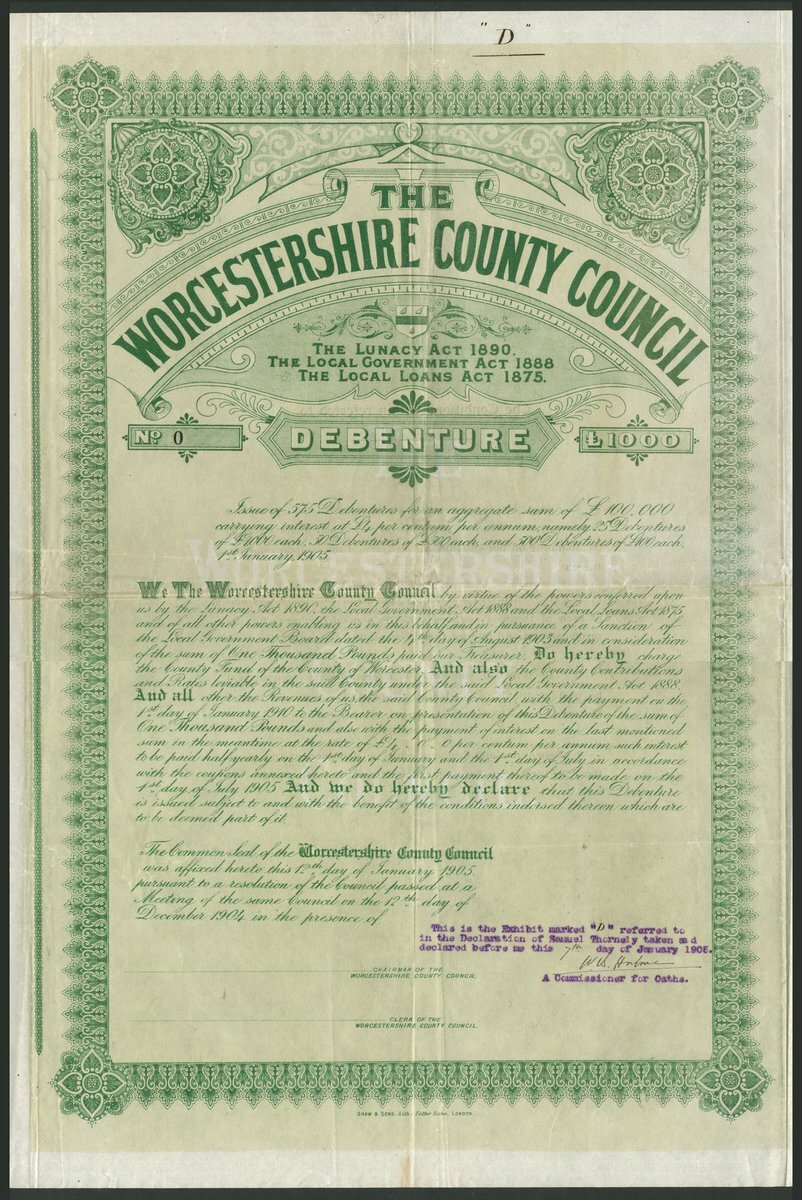 Great Britain: Worcestershire County Council, a specimen £1000 debenture, 1905, printed by Shaw & Sons, very large format piece printed in green, with coupons at either side. Annotated stating that this certificate was exhibited at court in 1905, referring to a declaration by Samuel Thornley, who was Clerk to the Council. VF the only example known [R12].