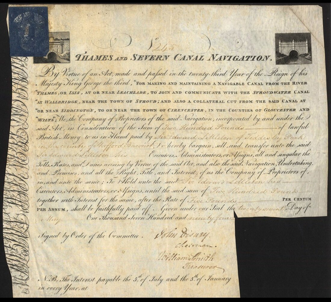 Great Britain: Thames & Severn Canal Navigation, a general bond for £[200], 17[94], #245, signed by John Disney as Chairman, attractive piece, on vellum, with two vignettes of canal tunnels at top, black printing, on vellum, seal removed as cancellation. Completed in 1789 to connect The Thames at Inglesham Lock near Lechlade to the Stroudwater Navigation. The Sapperton Tunnel was at the time the longest in the country. Failed due to railway competition and abandoned in 1927. Like many others now in the hands of a Trust and open for pleasure craft. VF.