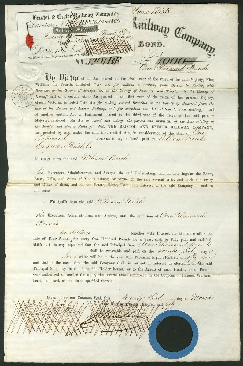 Great Britain: Bristol & Exeter Railway Company, £[1000] debenture bond, 18[50], #1261BF, black, blue seal, with coupons. A broad gauge line joining the two towns built by Isambard Kingdom Brunel. Amalgamated with the Great Western Railway in 1876. Middle of seal removed as cancellation, ink cancelled through signatures.