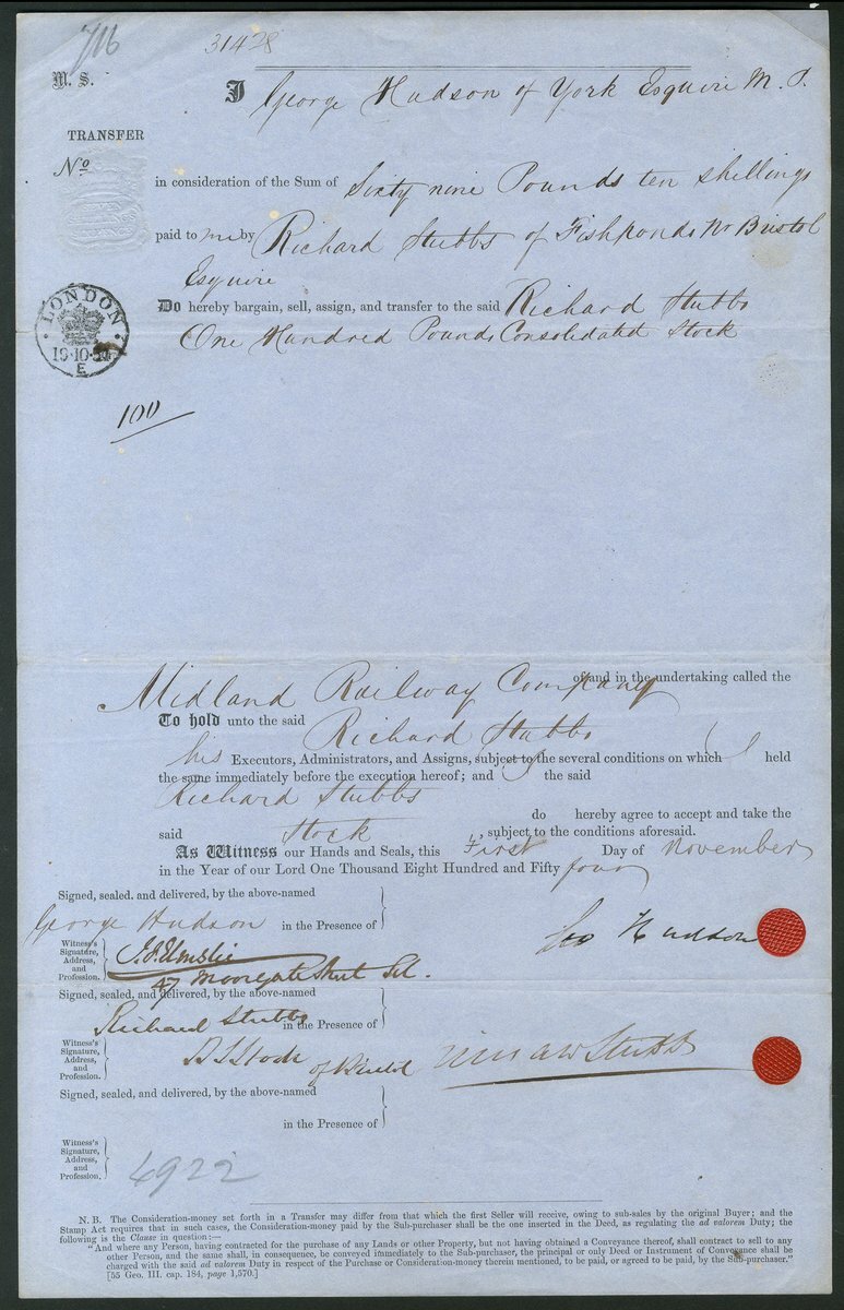 Great Britain: George Hudson M.P. and the Midland Railway Company, a share transfer certificate for the sale by Hudson of £100 Midland Railway consolidated stock, 185[4], handsigned by Hudson at the bottom. George Hudson , 1800 - 1871, railway financier and politician, M.P. for Sunderland, 1845 - 1859. He controlled about 1000 miles of railway through his Midland, Eastern Counties, York, Newcastle and Berwick and the York & North Midlands Railways. Termed the 'Railway King' from 1844. His finances however turned out to be questionable and in 1849 a series of enquiries were launched exposing his methods. He later became bankrupt, lost his seat as M.P. and forced to live abroad to avoid being imprisoned for debt. VF.