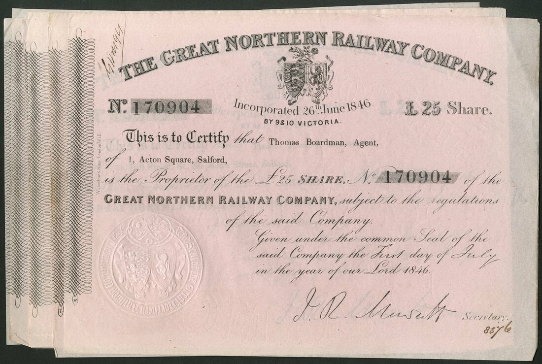 Great Britain: Great Northern Railway Company, a group of 6 certificates for £25 share, 1846, coat of arms in centre, black on pink paper. Generally EF (6).