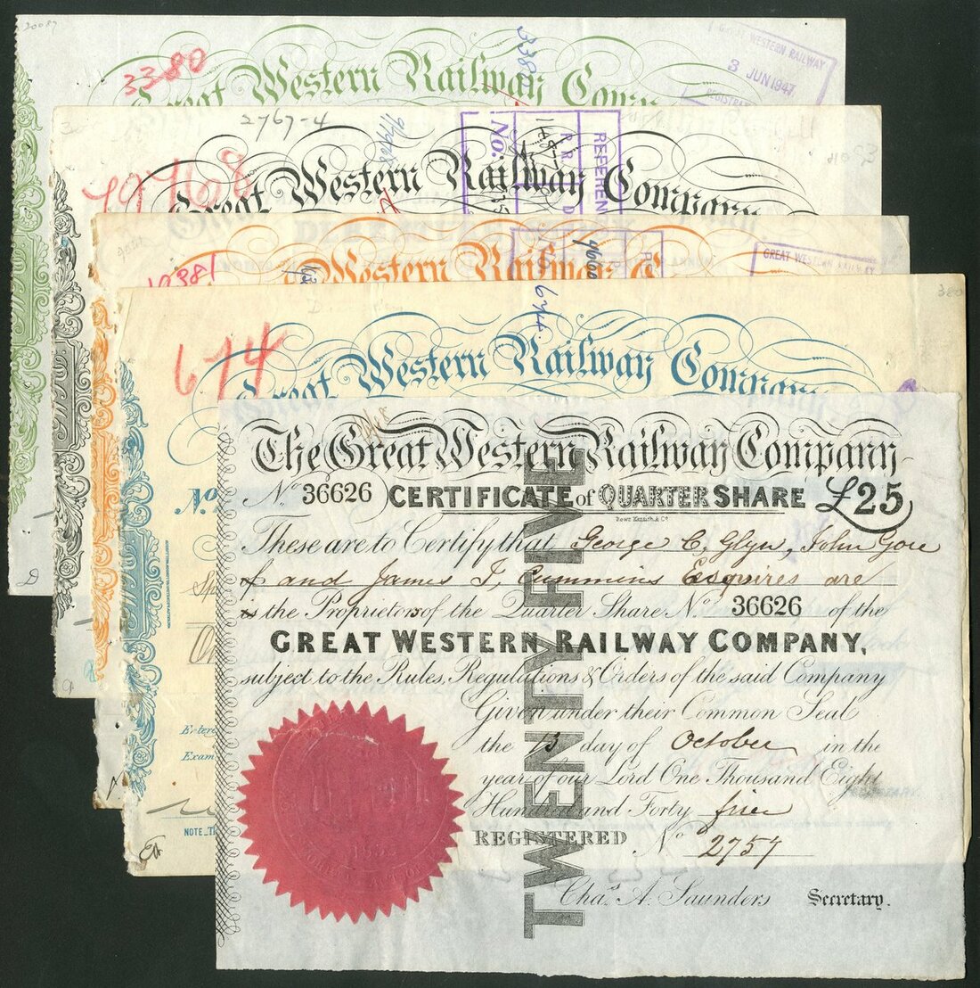Great Britain: Great Western Railway Company, £25 quarter share, 184[5], #36626, black, red seal, together with 4 later cancelled certificates comprising 5% Consolidated Preference stock, 1919; 5% Consolidated Guaranteed stock, 1894; 4½% Debenture stock, 1902 and 4% Debenture stock, 1930. The first EF, the remainder varied condition (5).