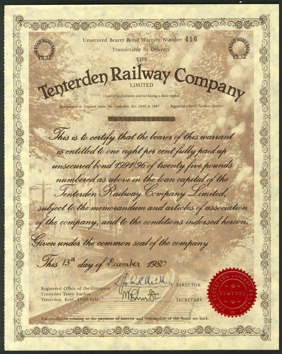 Great Britain: Tenterden Railway Company Limited, £25 bond, 19[80], #416, underprint of steam train, brown, red seal, with coupons. A heritage railway and tourist attrtaction on part of the old Kent and East Sussex Light Railway. EF.
