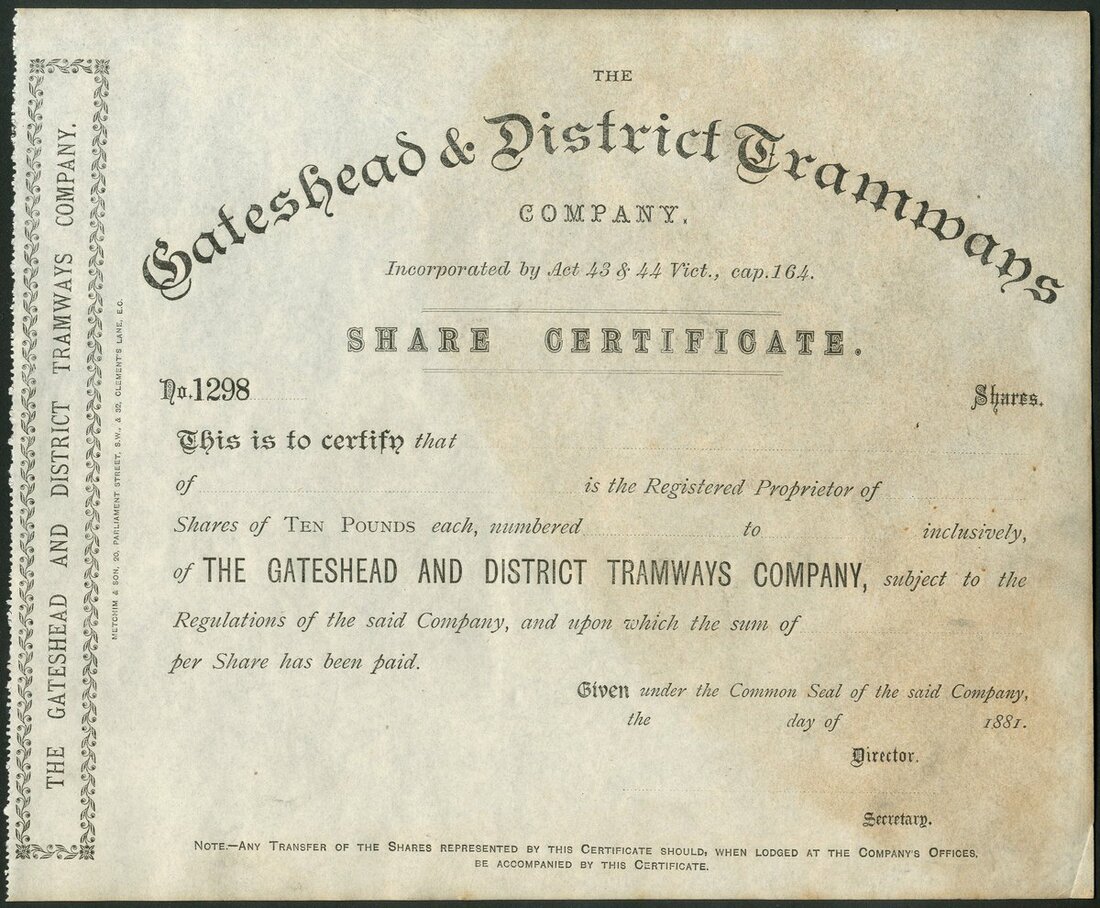 Great Britain: Gateshead & District Tramways Company, unissued certificate for £10 shares, 1881, #1298, black printing. Discoloured at right but EF and rare. No issued examples known.