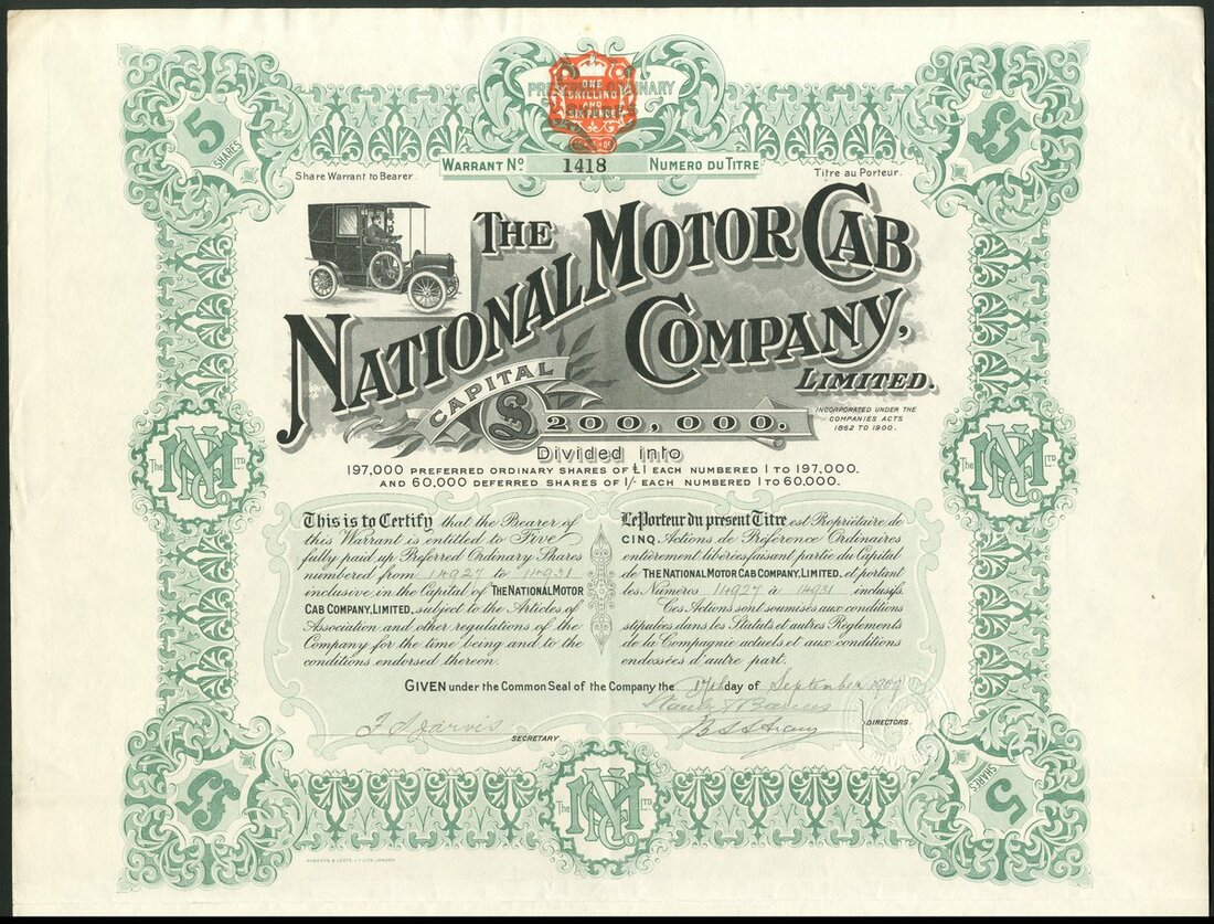 Great Britain: National Motor Cab Co. Ltd., bearer warrant for 5 preferred ordinary shares of £1, [1909], #1418, attractive large format piece with early motor cab at top left, ornate border, green and black, with coupons. Based in Hammersmith, one of the largest operator with some 250 red coloured cabs supplied by French manufacturer UNIC. The boom in cabs was shortlived and the company had to reduce its fleet mainly by converting them to delivery trucks. The company was reorganised as National Motor Cab (1922) Ltd., and diversified into other areas of the motor trade becoming concessionaires for the KRC light car. GVF.