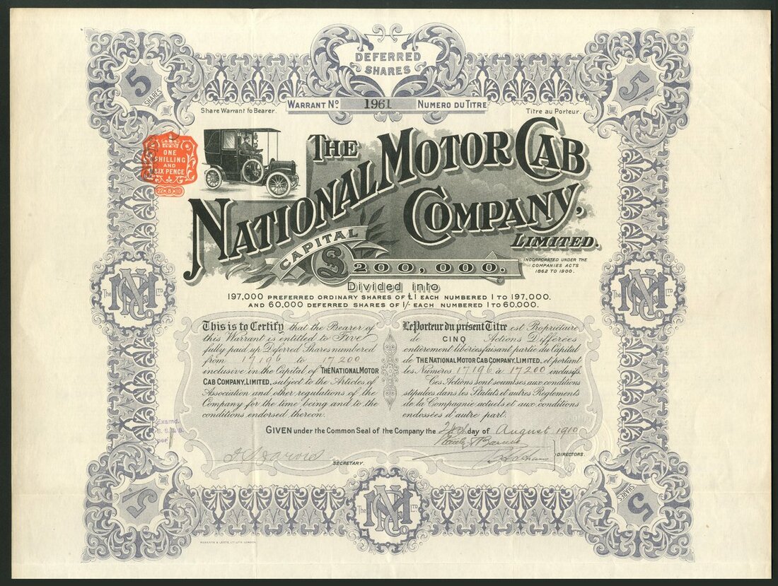 Great Britain: National Motor Cab Co. Ltd., bearer warrant for 5 deferred shares of 1/-, [1910], #1961, attractive large format piece with early motor cab at top left, ornate border, mauve and black, with coupons. Based in Hammersmith, one of the largest operator with some 250 red coloured cabs supplied by French manufacturer UNIC. The boom in cabs was shortlived and the company had to reduce its fleet mainly by converting them to delivery trucks. The company was reorganised as National Motor Cab (1922) Ltd., and diversified into other areas of the motor trade becoming concessionaires for the KRC light car. GVF.