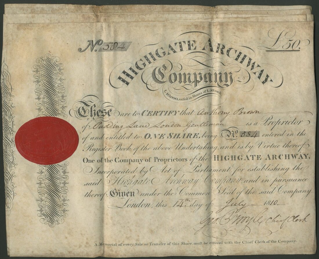 Great Britain: Highgate Archway Company, a small group of 5 certificates of £50 shares, London 18[10], #584, #585, #590, #591 and #592, attractive black printing, on vellum, red wax paper seal at left (missing on #590 and #592. Formed to cut a tunnel through the steep hill at Highgate, North London, which collapsed when almost complete, forming the present cutting. The company then built the bridge across, which was rebuilt at the turn of the century. Much toning otherwise VF [R7] (5).