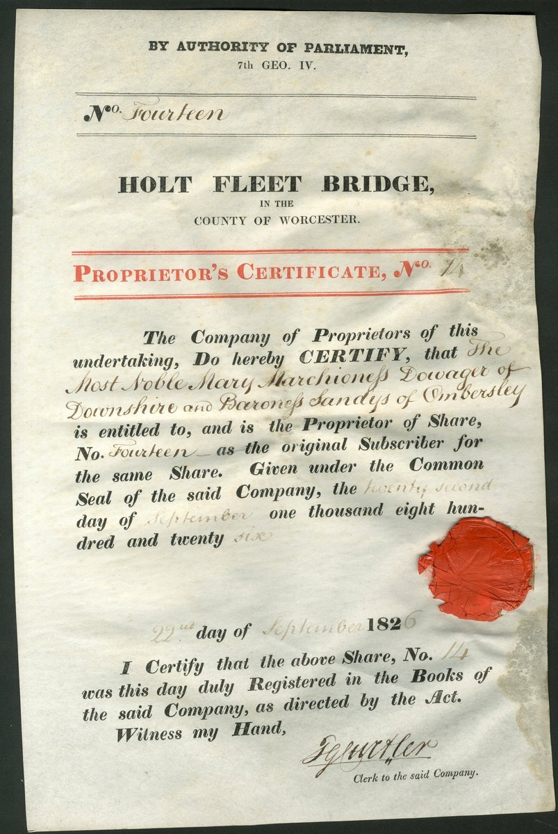 Great Britain: Holt Fleet Bridge, Worcestershire, certificate for 1 share, 182[6], #14, black and red printing on vellum, red wax seal. A single arch bridge built by Thomas Telford in 1828 and opened in 1830, crossing the River Severn at the village of Holt Fleet in Worcestershire.