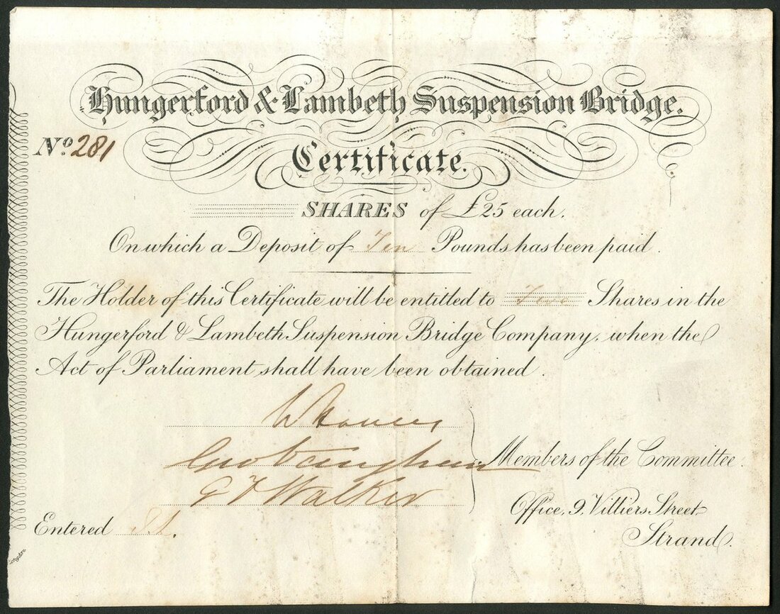 Great Britain: Hungerford & Lambeth Suspension Bridge, scrip certificate for £25 shares, undated but circa 1836, #281, small format, black. Authorised by Act of Parliament in 1836, amended in 1843 and opened in 1845. Designed by Isambard Kingdom Brunel. In 1859 however, the Charing Cross Railway Act authorised the new railway and the building of a new bridge. The old bridge was dismantled, the chains being sold for use on the Clifton Suspension Bridge. This certificate was for a deposit on the shares used to pay the high costs of obtaining the Act of Parliament. VF.