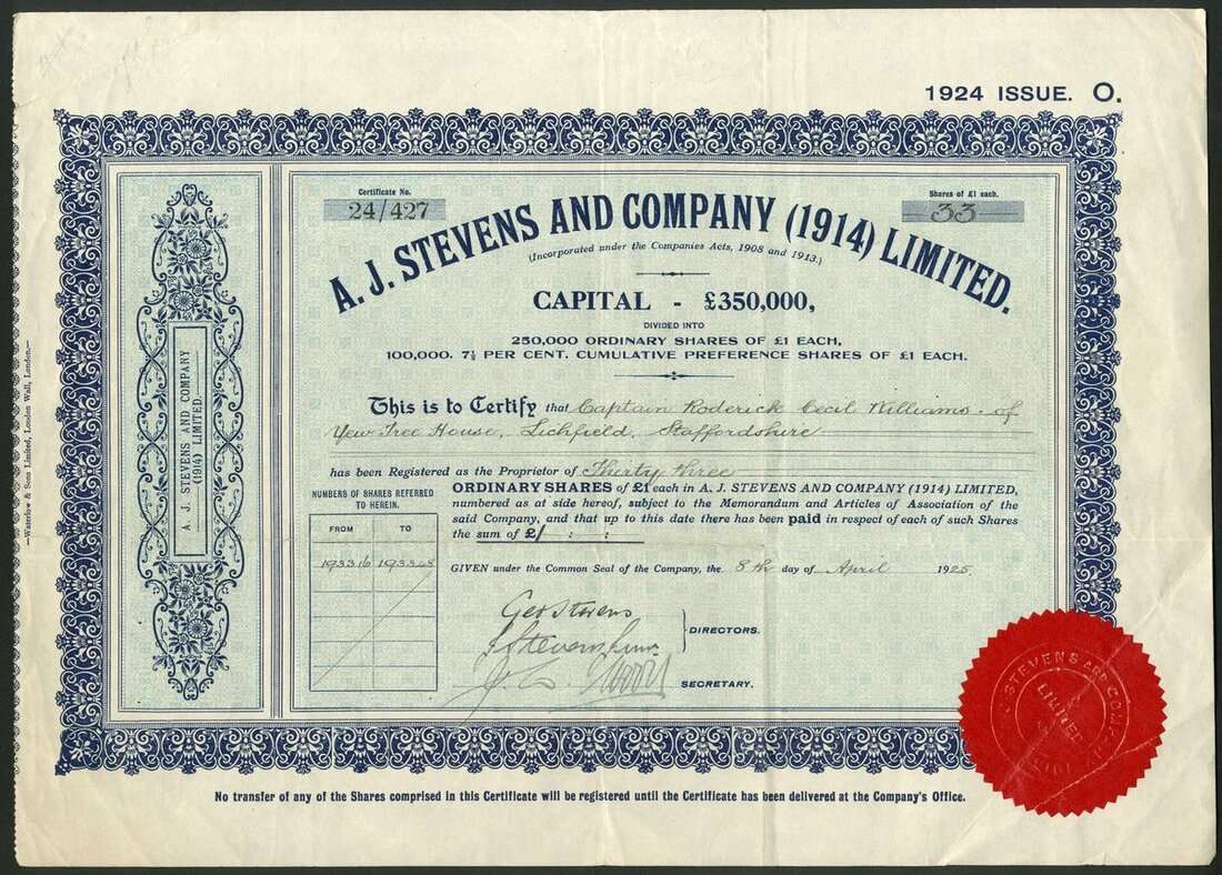 Great Britain: A.J. Stevens & Co. (1914) Ltd., £1 ordinary shares, 19[25], #24/427, capital £350,000, blue, red paper seal, printed by Waterlow & Sons. Motorcycle producer from 1909 (AJS) which lasted into the 1960's. Built a light car in the early 30's. The designs were taken over by Willys-Overland Crossley. VF and scarce.