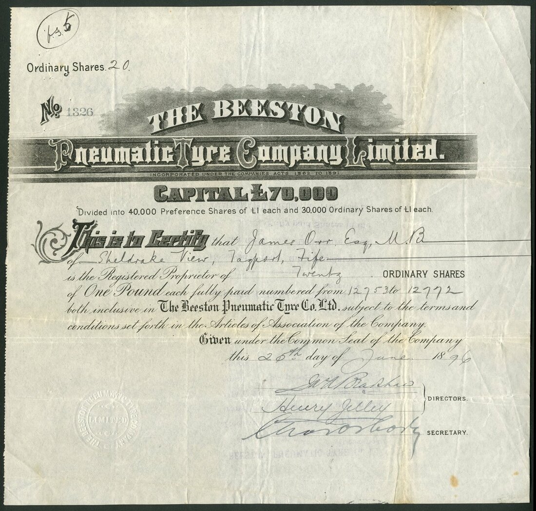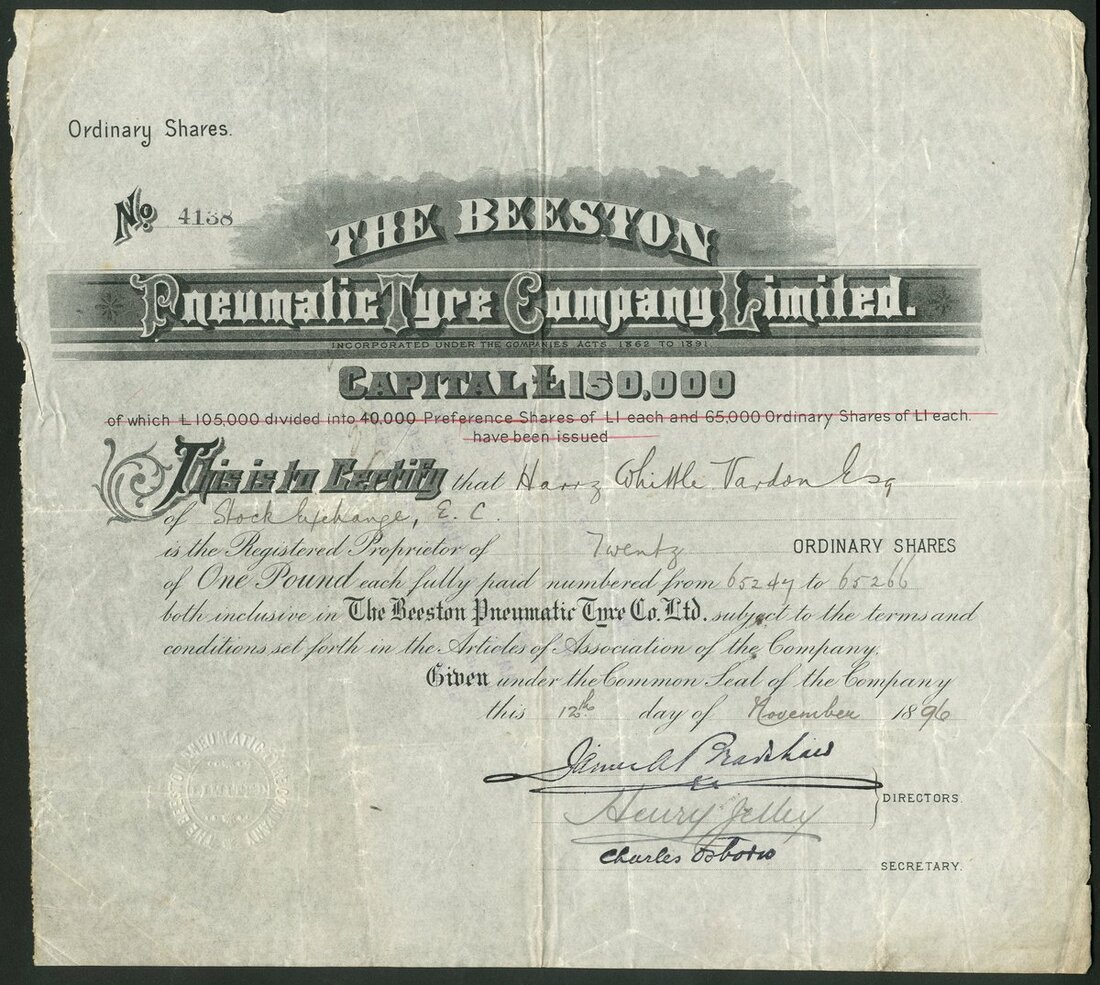 Great Britain: Beeston Pneumatic Tyre Company Ltd., a rare pair of certificates for £1 shares, 18[96], #1326, capital £70,000 and 18[96], #4138, capital £150,000, black. This was a Harry Lawson company promoted in 1893 and sharing its premises with Daimler at Motor Mills, Coventry. Wound up and taken over by Amalgamated Pneumatic Tyre Companies Ltd. in 1898. VF and AVF (2),