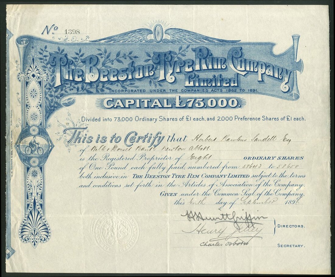 Great Britain: Beeston Tyre Rim Co. Ltd., £1 ordinary shares, 189[6], #1398, attractive printing with cyclist at left, blue. Acquired cycle patents from the old Barton and Loudon business in Coventry, promoted by Harry Lawson and E.T.Hooley who all but controlled the early motor industry patents. VF and rare.