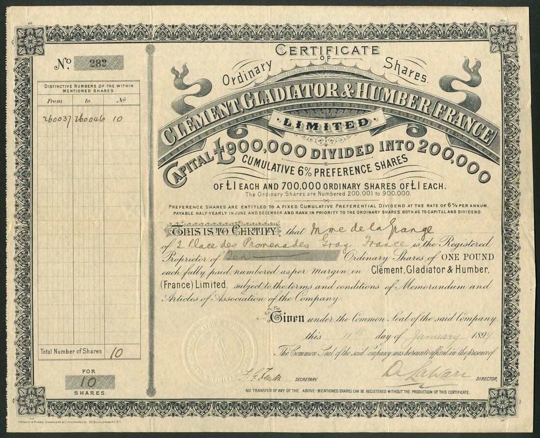 Great Britain/France: Clément, Gladiator & Humber (France) Ltd., £1 ordinary shares, 189[7], #282, ornate border, black, signed by Earl de la Warr as director. Formed by Harvey du Cros of Dunlop fame to acquire Gladiator Cycles and the Clement tyre business in Paris and the Humber company in England. Manufactured cycles, motor cycles and motor cars, many of which were sold in England. IN 1903 the company was divided forming Clement Talbot Ltd. in England and Clement Gladiator in France. Humber was again to become independent. VF and rare.