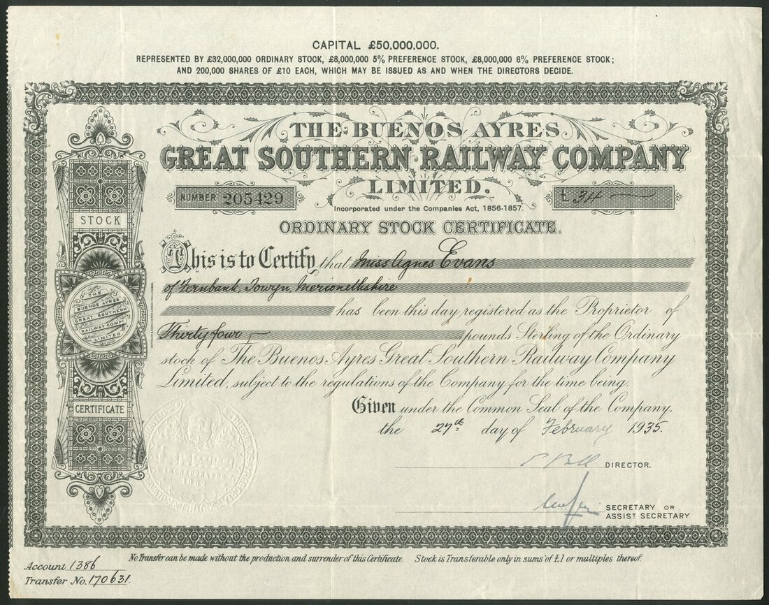 Argentina: Buenos Ayres Great Southern Railway Co. Ltd., ordinary stock certificate, 19[35], #205429, attractive scrollwork at left, black, printed by Waterlow & Sons. GVF and scarce despite the high serial number.