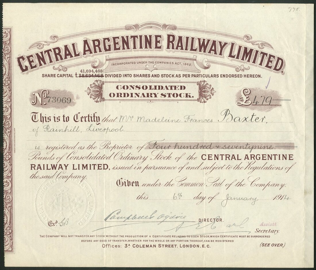 Argentina: Central Argentine Railway Ltd., Consolidated Ordinary stock certificate for £[479], 191[4], #73069, purple printing by Waterlow & Sons, capital increase overprinted. GVF and rare type despite the high serial number.