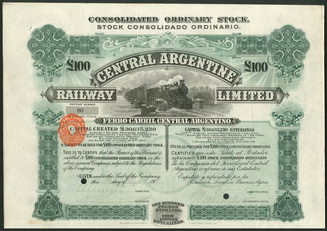 Argentina: Central Argentine Railway Ltd., Consolidated Ordinary stock, £100, 191[1], #80, steam train in centre, green and black printing by Waterlow & Sons, with coupons. Single hole cancel. GVF.