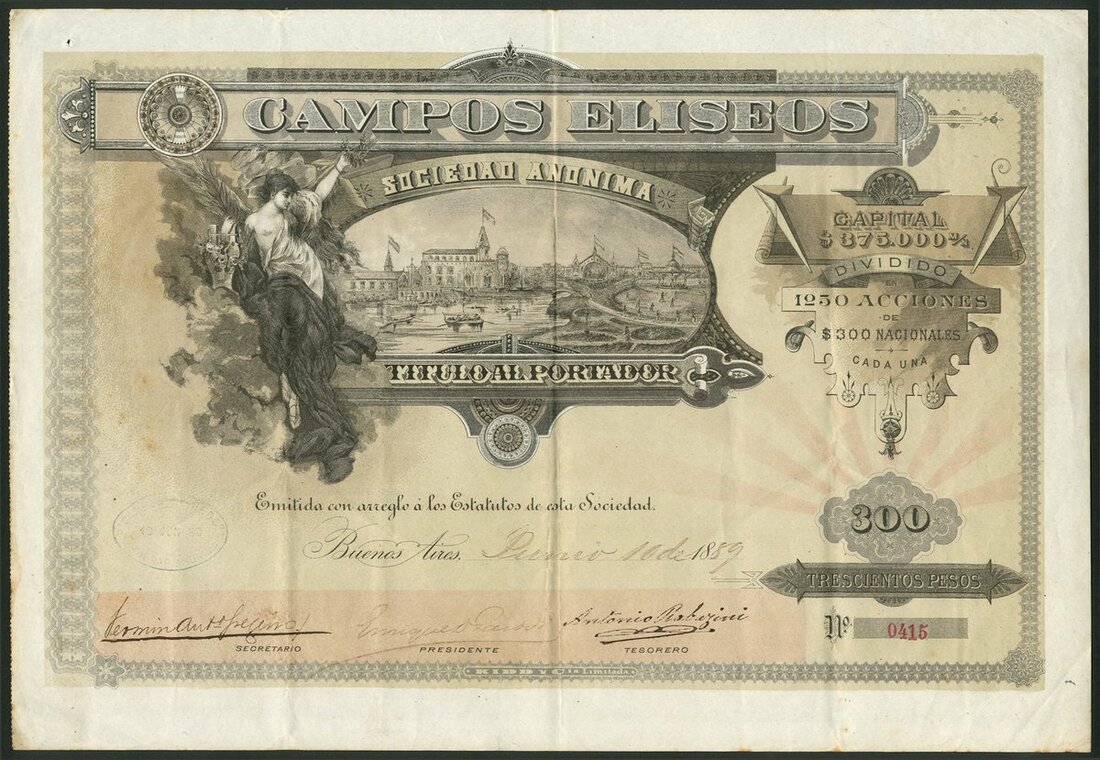 (x) Argentina: S.A. Campos Eliseos, 300 Pesos bearer share, Buenos Aires 18[89], #0415, lovely vignette of a recreational river and parkland scene with many different entertainments, allegorical figure at left, black with pink and yellow underprint depicting sun rays. In Greek mythology The Elysian Fields are the final resting place for the virtuous and heroic, signifying a good place to be - consequently the name became popular with property developers when designing new townships and recreational parks.