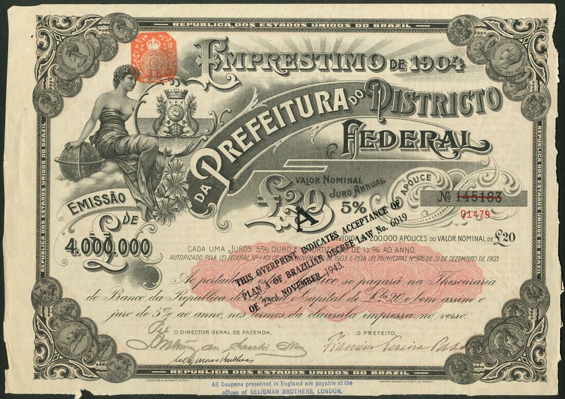 Brazil: 1904 Federal District 5% Loan, £20 bond, #145183, renumbered to 01479, coat of arms and allegorical female at top left, black, pink underprint, with coupons from 1980. The loan was issued when the Federal District was around Rio de Janeiro. In 1960 this was moved to the centre of the country when Brasilia was made the capital. The loan was quoted until around 2000 and then repaid in full. This missed the repayment. Small tears at left edge, GVF and now scarce.