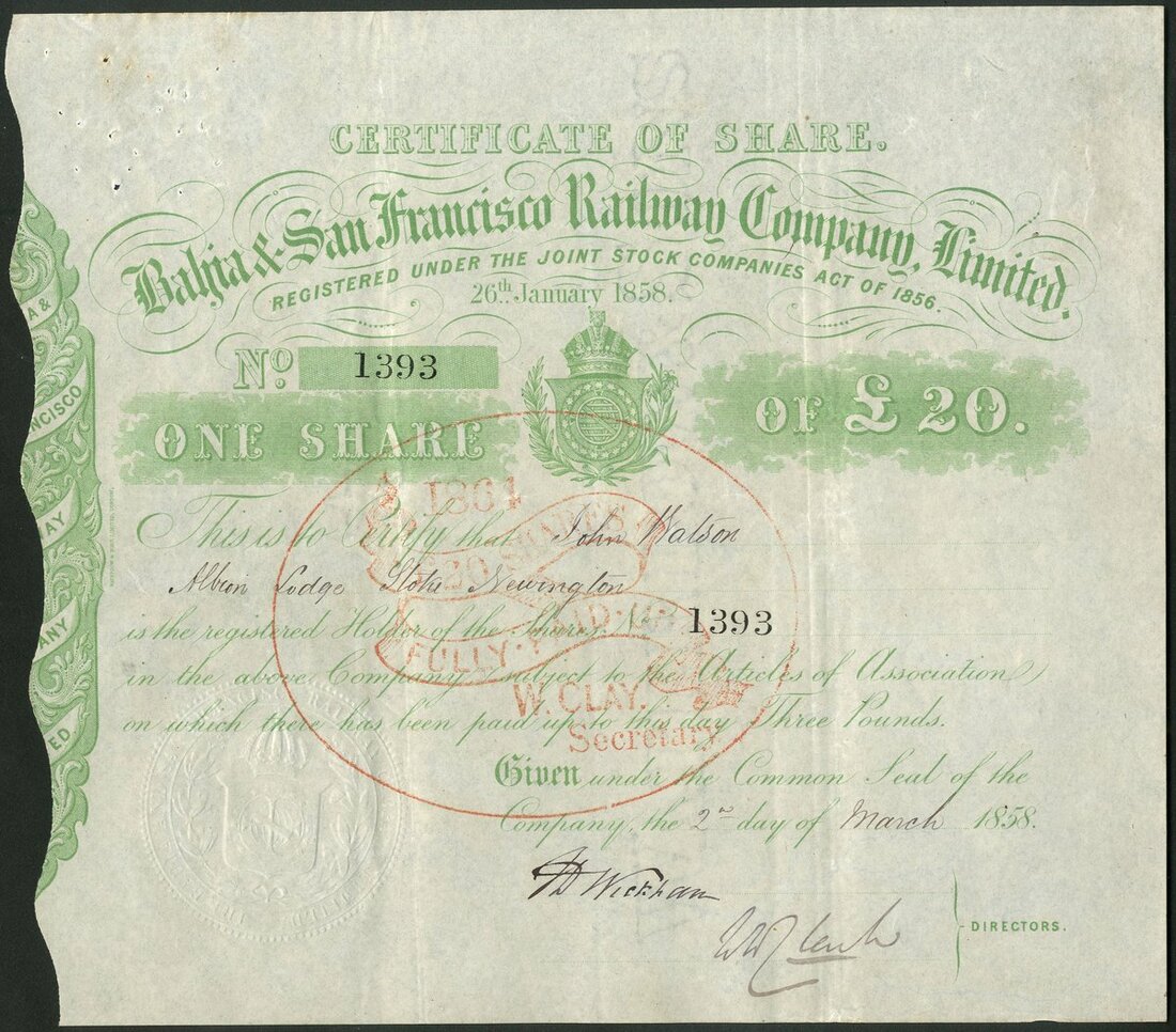 Brazil: Bahia & San Francisco Railway Co. Ltd., one £20 share, £3 paid, 1858, #1393, Brazilian arms in centre, green, red endorsement showing shares as fully paid in 1864, printed by Waterlow & Sons. VF and rare.