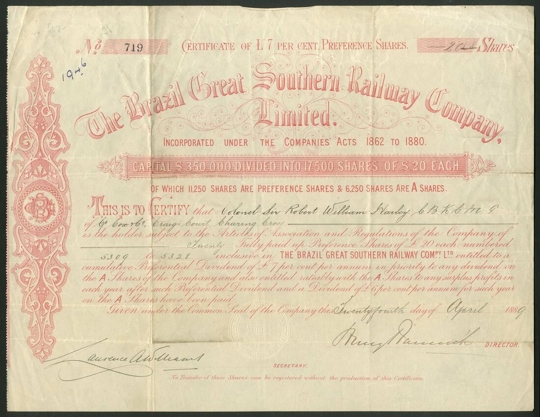 Brazil: Brazil Great Southern Railway Co. td., 7% preference shares, 188[9], #719, scrollwork at left, red. VF and a rare type.