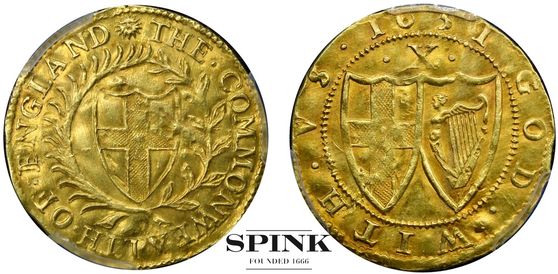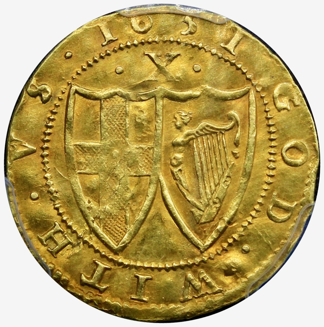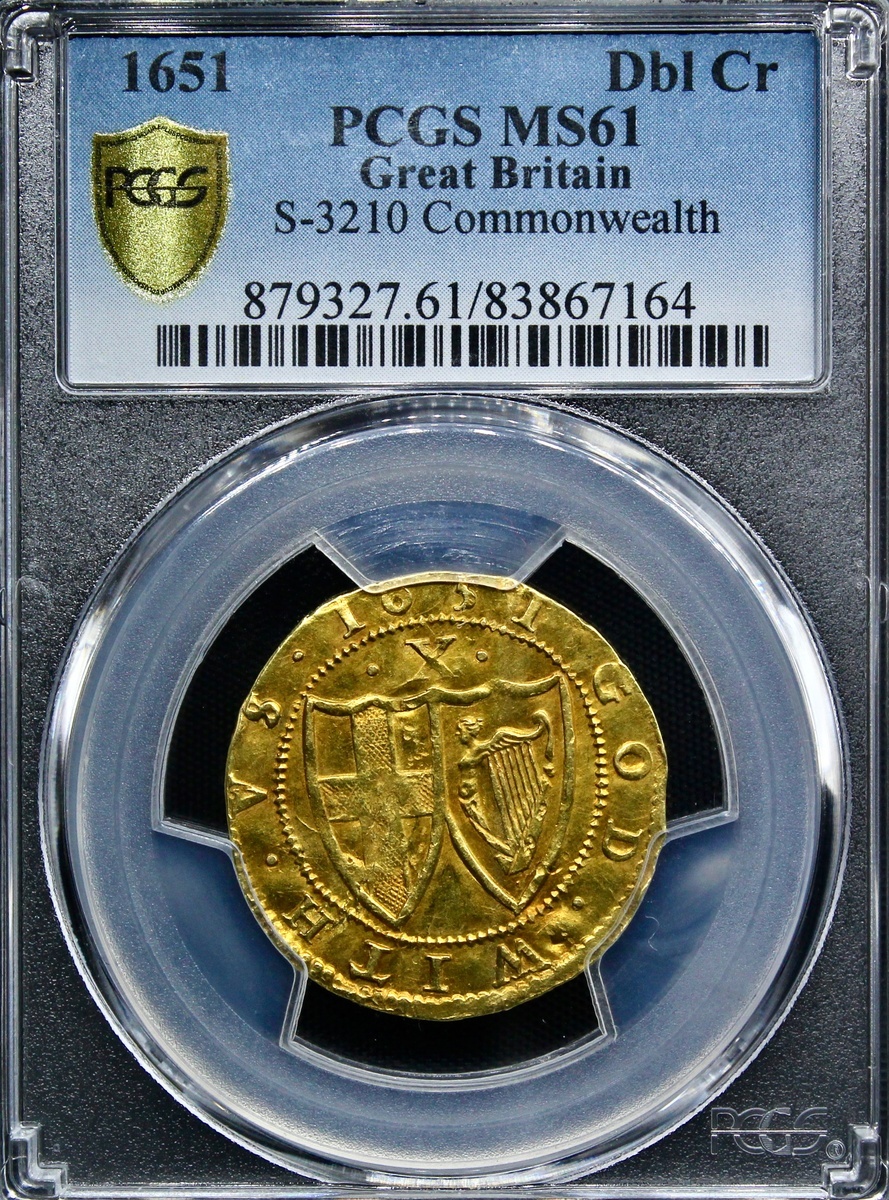 Commonwealth, gold Double-Crown, 1651, Tower, 2h, m.m. sun (on obv. only) (cf. Schneider II, 350; N.2717; S.3210), double-creased, with a light tone, otherwise struck very fine, rare, in PCGS holder, graded MS61 (Cert. #83867164)