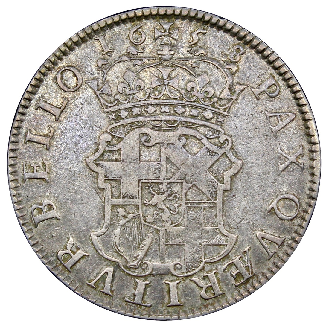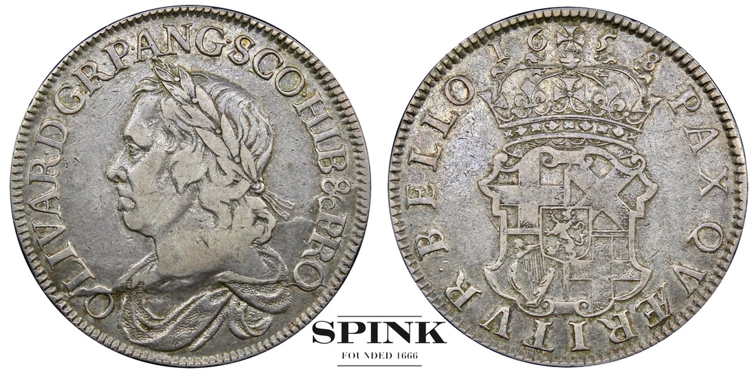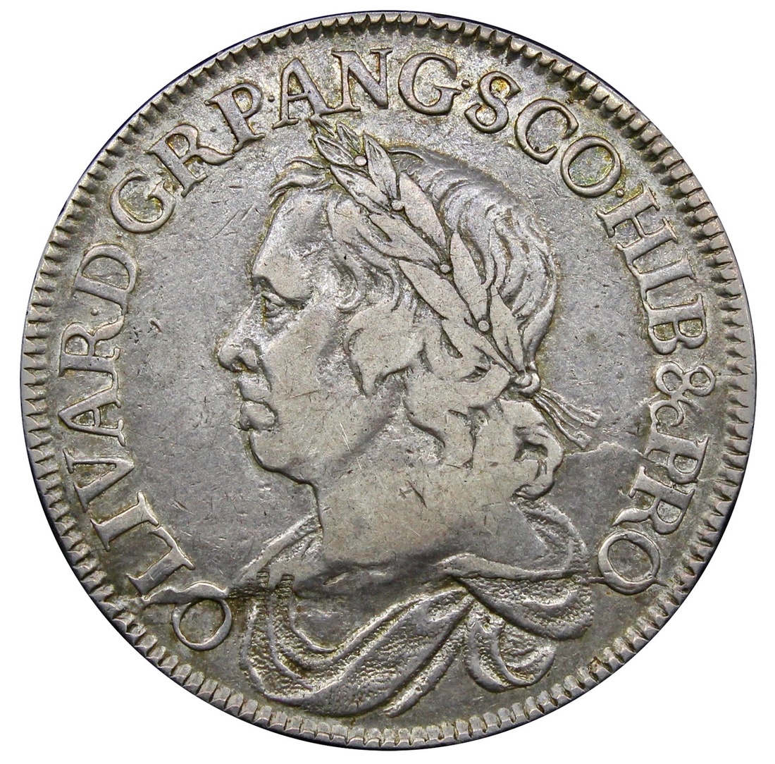Cromwell, Crown, 1658 over 7 (L&S E12; ESC 240 [10]; S.3226), some light smoothing neck and tooling to drapery to 'style out' the famous die flaw, exhibited here in the latest stage of die break with additional flaw through PRO, otherwise old toning, good fine, an appreciable example of the 'first milled Crown'