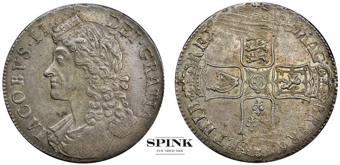 James II, Crown, 1688 QVARTO, rev. eight strings to harp (ESC 746 [80]; S.3407), flan adjustment marks at 12 and 6 o'clock causing resultant striking weakness, otherwise bold for issue with attractive iridescence in recesses, approaching extremely fine