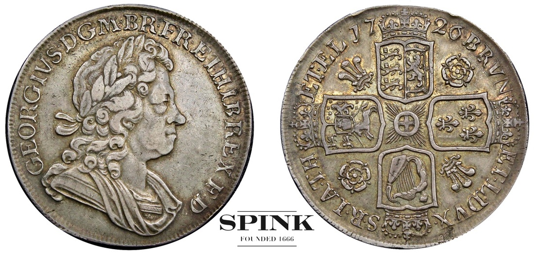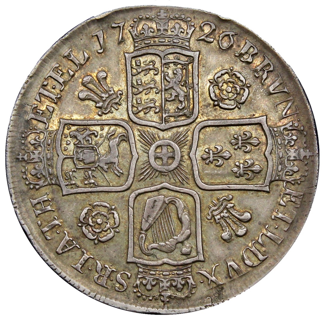 George I, Crown, 1726 DECIMO TERTIO, rev. nine strings to harp, small roses and plumes in angles, all Ns inverted on edge (Dr Erik Miller, lot 37; ESC 1542 [115]; S.3639A), nicely toned especially to reverse, a pleasing very fine/a really good very fine, rare