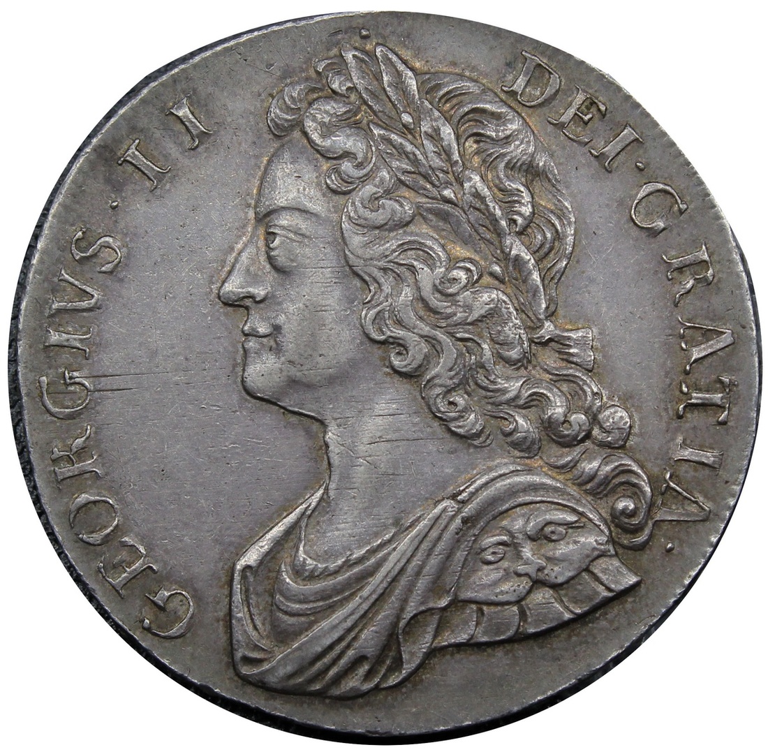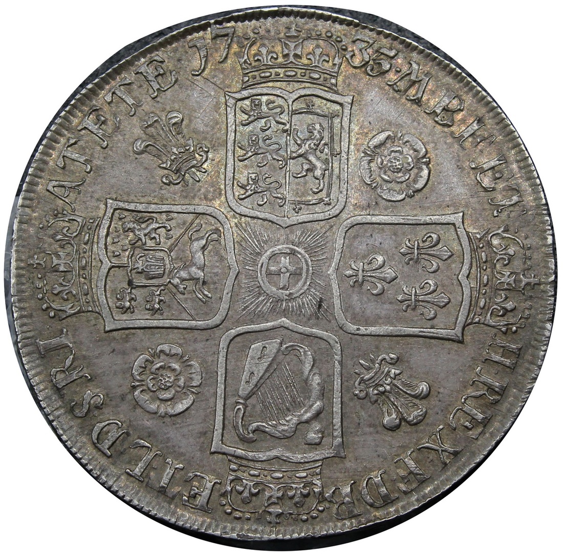 George II, Crown, 1735 OCTAVO, no stop after II, rev. fourteen strings to harp, roses and plumes in angles (ESC 1663 [120]; S.3686), slight adjustment marks to portrait, otherwise toned, near extremely fine