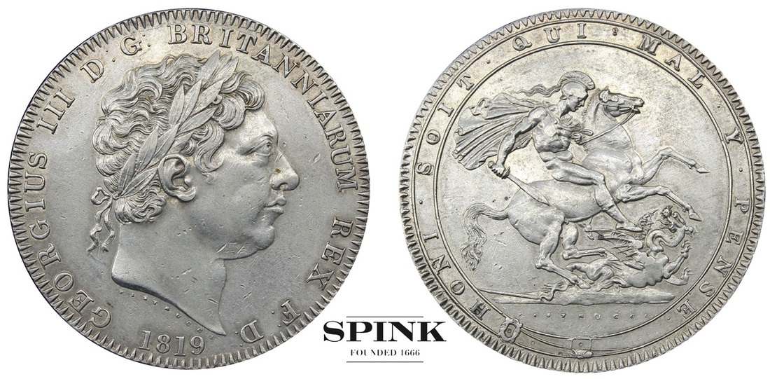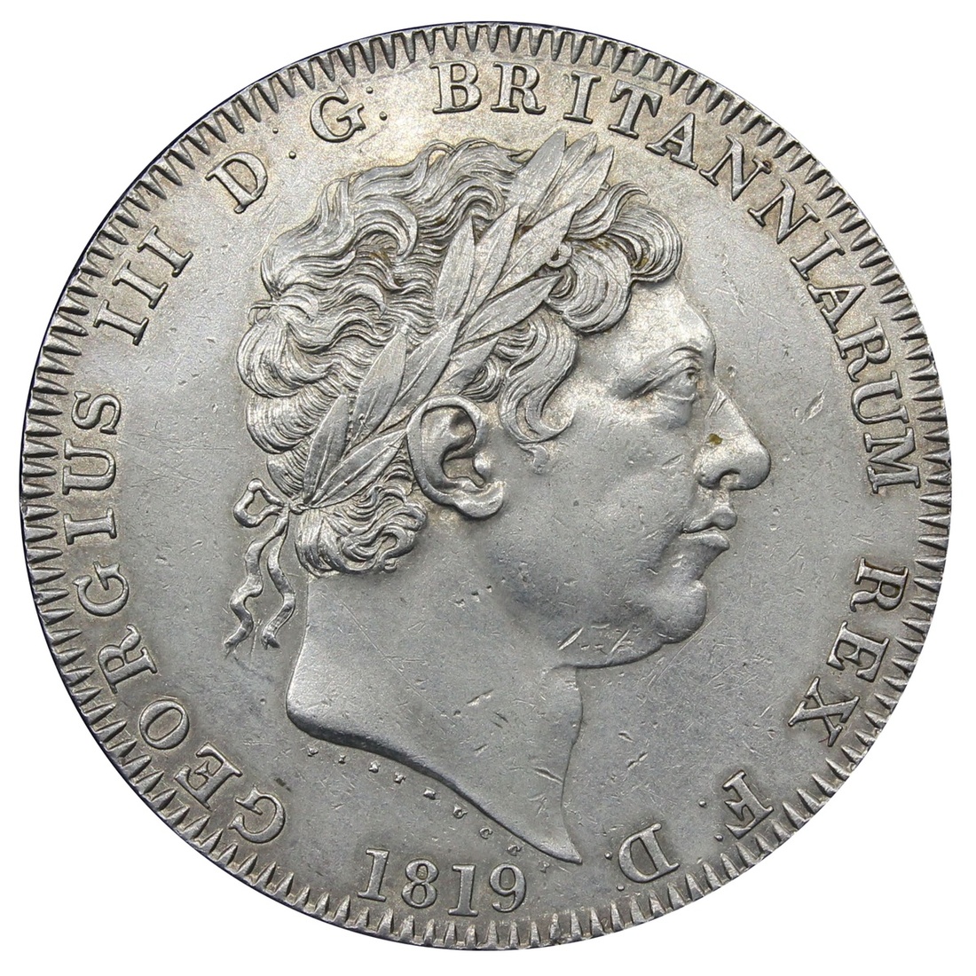 George III, Crown, 1819 LIX, no stops on edge, rev. the S in SOIT punched over a lower S (ESC 2011 [215A ~ R3]; S.3787), lightly cleaned with surface marks, otherwise a really bold very fine, rare