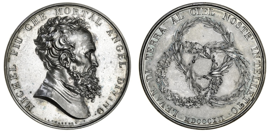 Italy, Academy of Fine Arts, Florence, 1812, AR Prize Medal, by G A Santarelli, MICHEL PIU CHE MORTAL ANGEL DIVINO, bust right, rev., LEVAN DI TERRA AL CIEL NOSTR' INTELLETO - MDCCCXII, three laurels wreaths, 97.10g, 54mm (Eidlitz 178; Bramsen 1185; BDM V, 335), toned, near extremely fine, scarce
