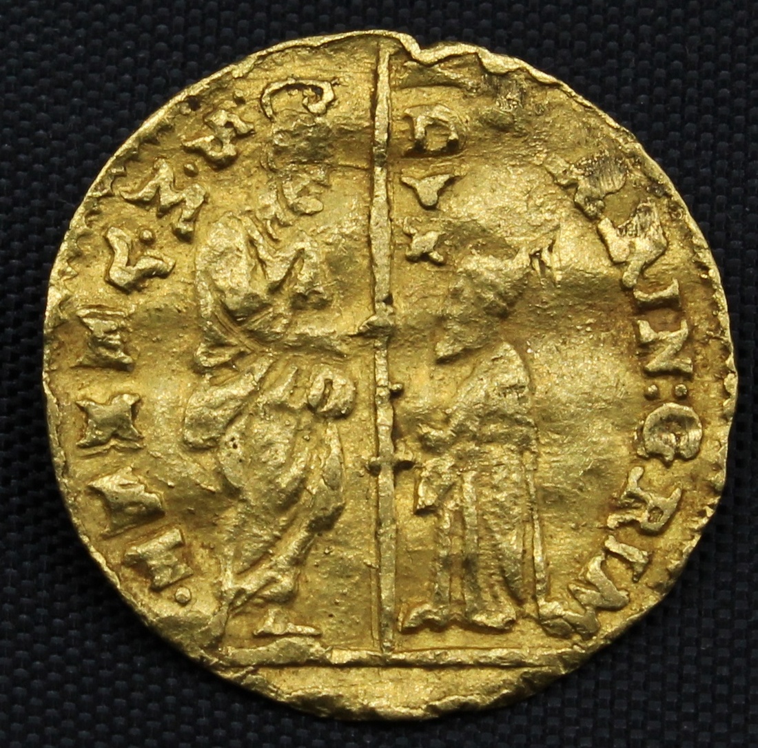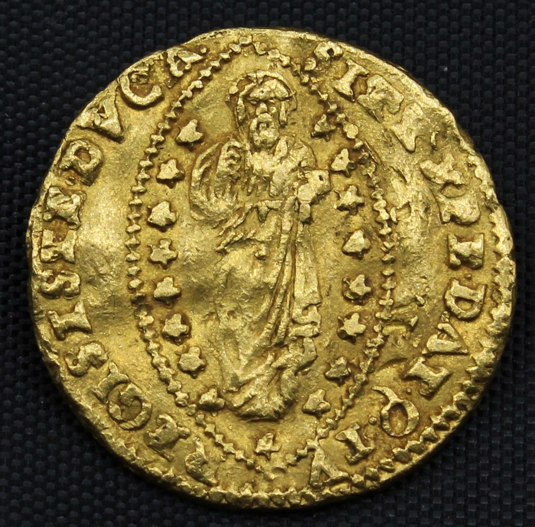 Italy, Venice, Marino Grimani (1595-1605), gold Zecchino (Ducat), MARIN : GRIM | DVX | S M VENET., St. Mark standing right, presenting staff with banner to Doge kneeling left, rev. SIT T XPE DAT Q TV REGIS ISTE DVCA., Christ the Redeemer standing facing within mandorla of seventeen stars, 10h, 3.49g (KM 305; F.1274), probably removed from a mount with creasing, a bolder fine