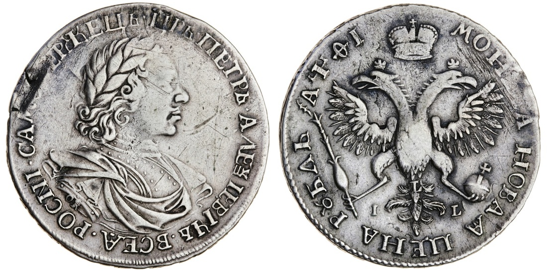 Russia, Peter I, the Great (1689-1725), Rouble, 1719 (Cyrillic date), Moscow, portrait, rev. eagle (Bitkin 824), traces of mounting, and once cleaned a bolder fine
