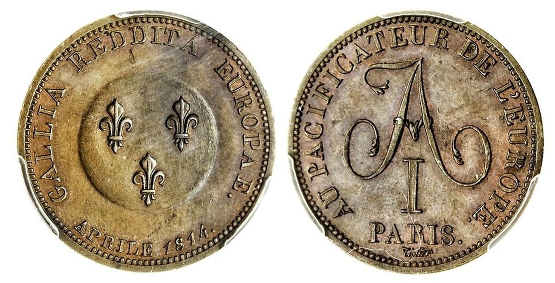 Russia, Visit of Tsar Alexander I to France, Module 2-Francs, 1814-A, Paris by N-P. Tiolier, royal cypher, no pellet, rev. fleur-de-lis on convex globe (Maz. 768a, var. PE), very rare, in PCGS holder, graded SP63BN (Cert #36122545)