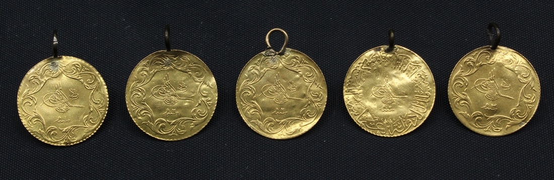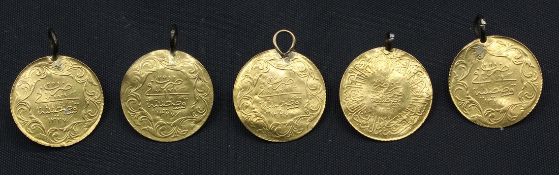 (g) Turkey, Ottoman Dynasty, Muhammad V (1909-18), Monnaie de Luxe, gold 25-Kurush (4), AH1327 / 2, 3, 4, 6, Muhammad VI (1918-23), Monnaie de Luxe, gold 25-Kurush, AH1336 / 2 (KM 763, 825), all pierced and repaired, generally very fine with integral loop mounts, thus probably made for jewellery (5)