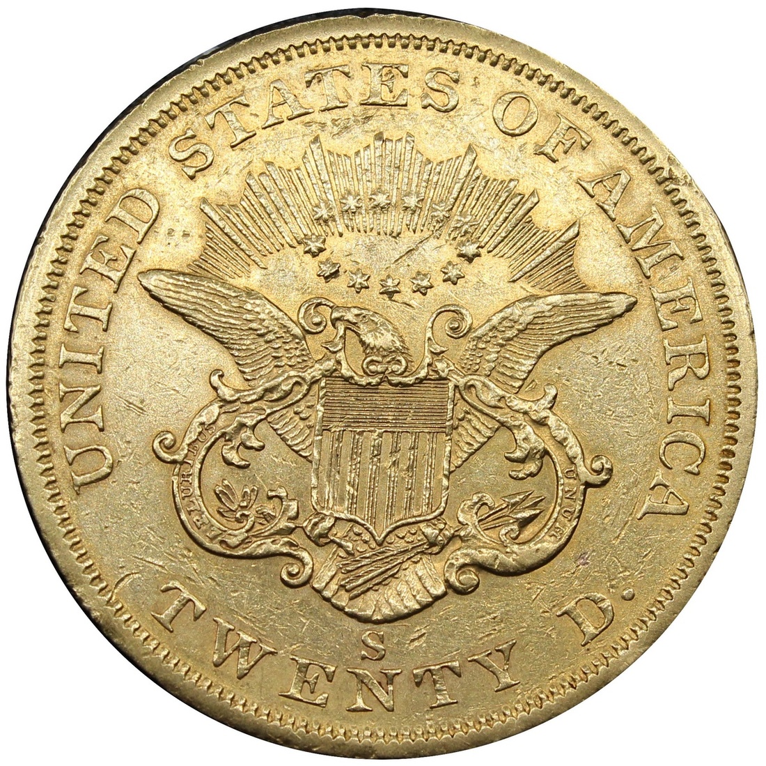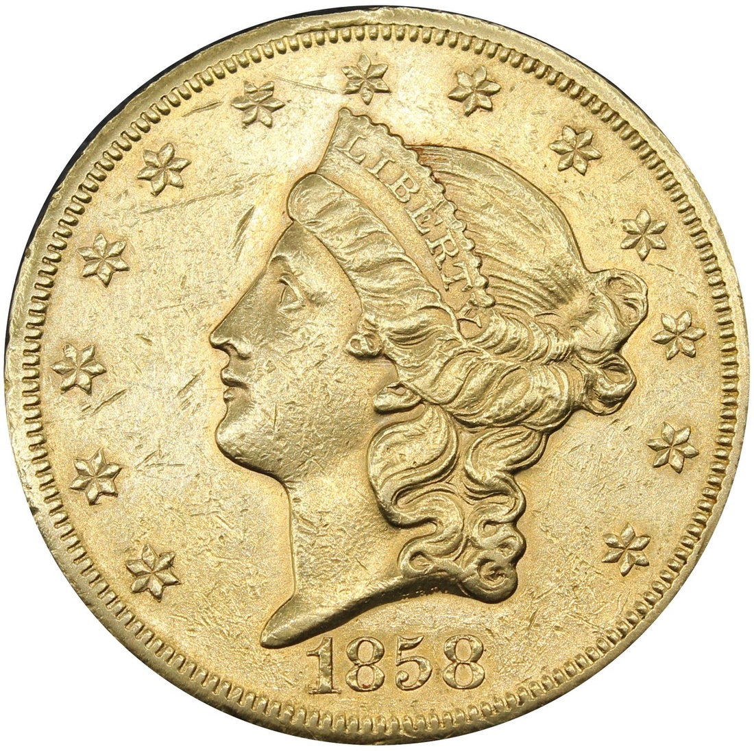 (g) USA $20 1858-S, Type 1 - No Motto, Liberty Head (Double-Eagle), San Francisco, by James Barton Longacre (PCGS ID #8925; NGC ID #2699), bagmarked and cleaned, otherwise a bold very fine