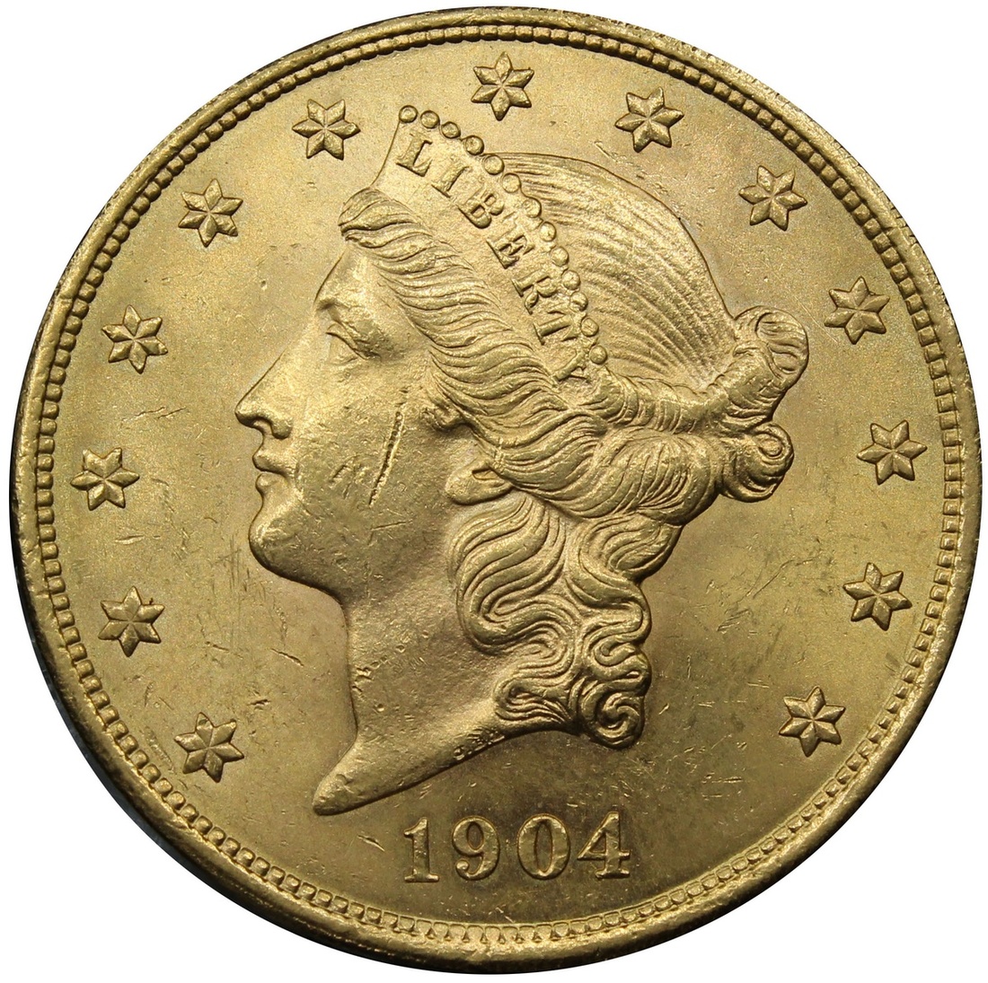 (g) USA $20 1904, Type 3 - With Motto, Liberty Head (Double-Eagle), Philadelphia, by James Barton Longacre (PCGS ID #9045; NGC ID #26CY), polished and sweated surfaces, about extremely fine