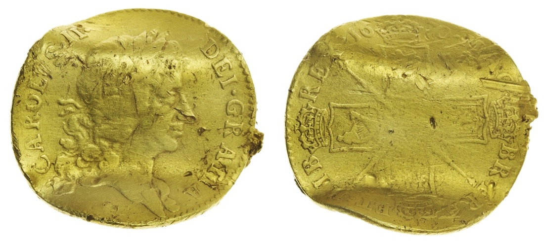 Charles II (1660-85), Guinea, 1670, third bust (Murdoch II, 534[b]; Schneider II, -; MCE 65; S.3342), fashioned into a lover's token with 's' bend in flan, some heavy scuffing and digs consistent with soil deposition, otherwise legible, struck details good to fair, the portrait better