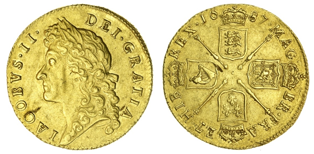 James II (1660-85), Guinea, 1687, second bust, nothing below truncation, 8.24g, 7h (Murdoch II, 696[b]; Schneider II, 457; MCE 128; S.3402), a trace of double-striking in legends with some other minor flawing by the O of IACOBVS and below French shield, and trace smoothing by nose, otherwise a pleasingly bold very fine on a fuller flan