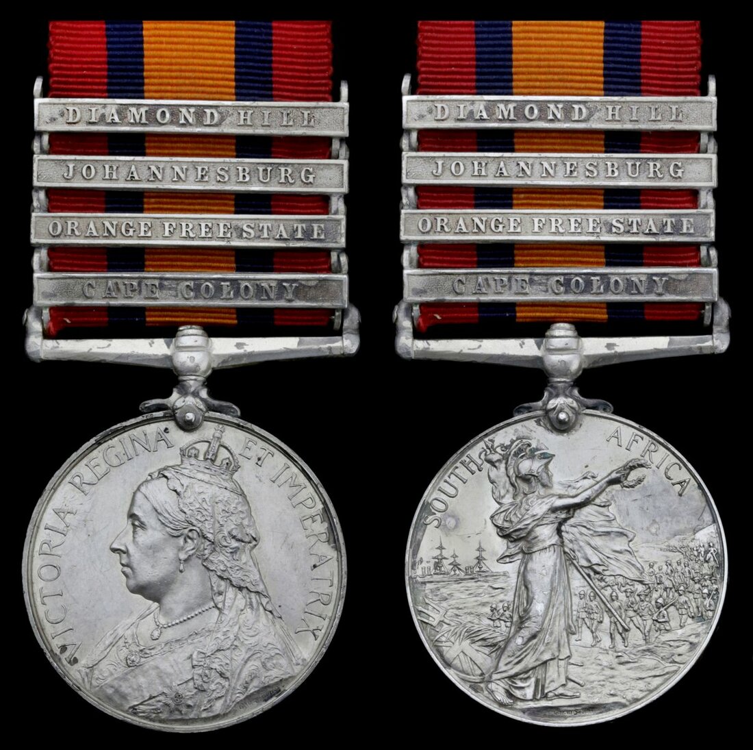 (x) Queen's South Africa 1899-1902, 4 clasps, Cape Colony, Orange Free State, Johannesburg, Diamond Hill (3429. Pte. M. Rice. 6 Drgns.), lacquered, good very fine