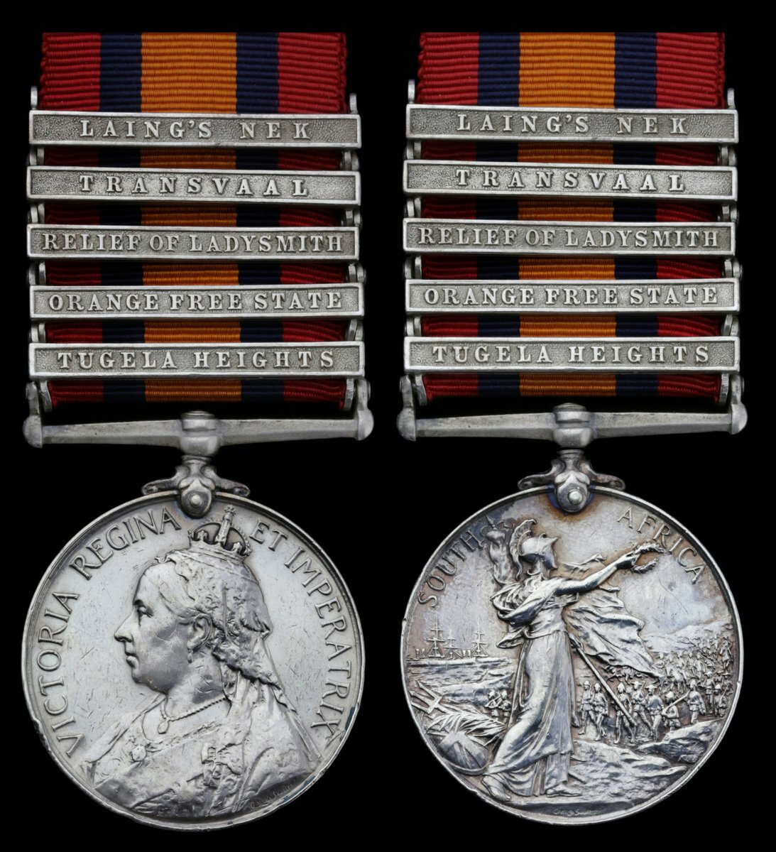 (x) Queen's South Africa 1899-1902, 5 clasps, Tugela Heights, Orange Free State, Relief of Ladysmith, Transvaal, Laing's Nek (4972 Pte A.J. Leach, Devon: Regt), suspension slack, polished, nearly very fine