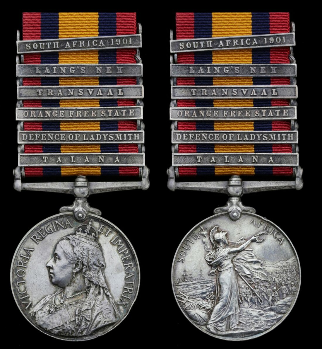 (x) Queen's South Africa 1899-1902, 6 clasps, Talana, Defence of Ladysmith, Orange Free State, Transvaal, Laing's Nek, South Africa 1901 (15018 Dvr. M. Leahy, 67th Bty., R.F.A.), date clasp loose upon riband, edge bruise, good very fine
