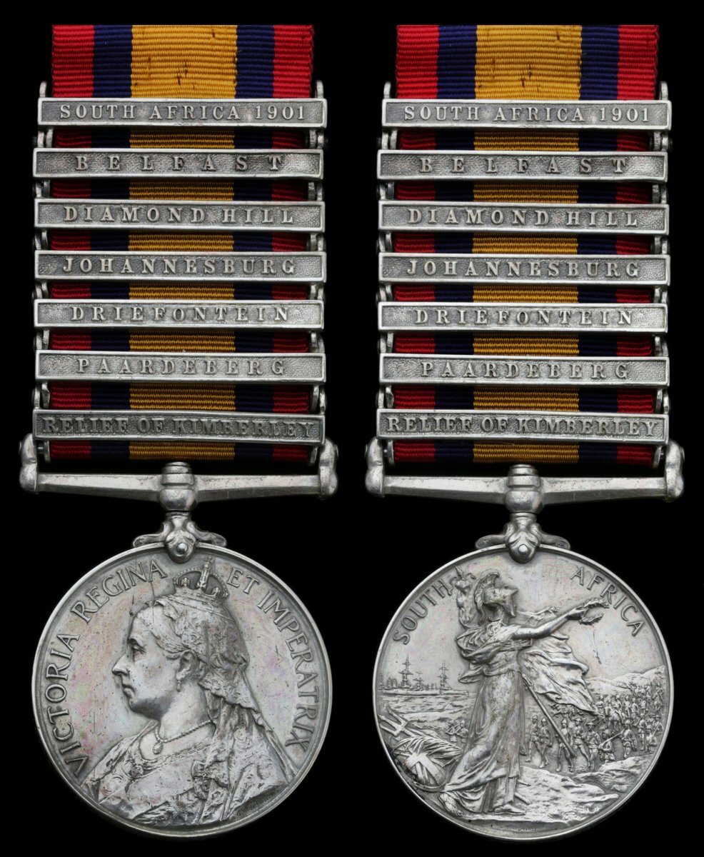 (x) Queen's South Africa 1899-1902, 7 clasps, Relief of Kimberley, Paardeberg, Driefontein, Johannesburg, Diamond Hill, Belfast, South Africa 1901 (7470 Pte N. Reynolds, Welsh Regt), unofficial rivets between state and date clasps, good very fine