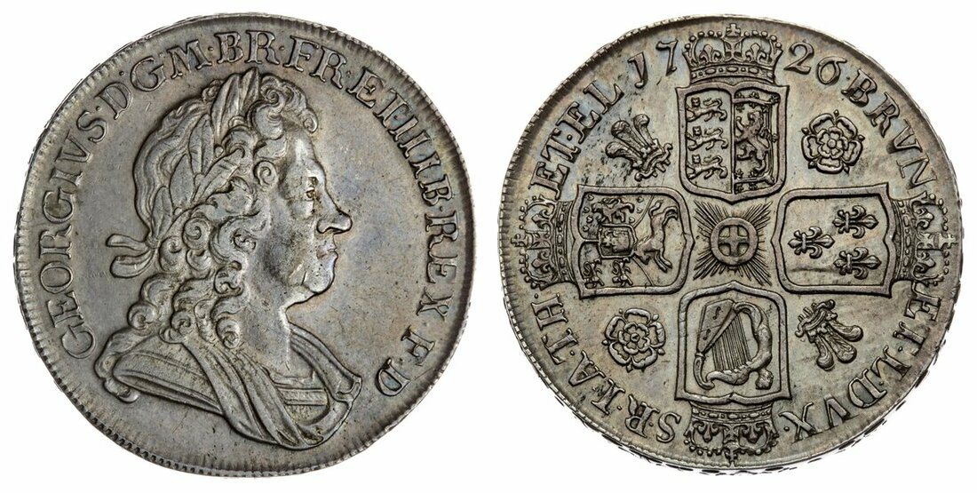 George I (1714-1727), 'Roses and Plumes' Crown, 1726 DECIMO TERTIO, laureate, draped and cuirassed bust right, rev. crowned shields cruciform, nine strings to harp, smaller roses and plumes in angles, inverted Ns in TUTAMEN ANNO REGNI lettered upwards on edge, 30.04g, 6h (Bull 1548 [R2]; ESC 115A; Pywell-Phillips 260; Miller 37; Spink 3639A), a few contact marks, otherwise lightly toned, good very fine / extremely fine, very rare and with a solid pedigree