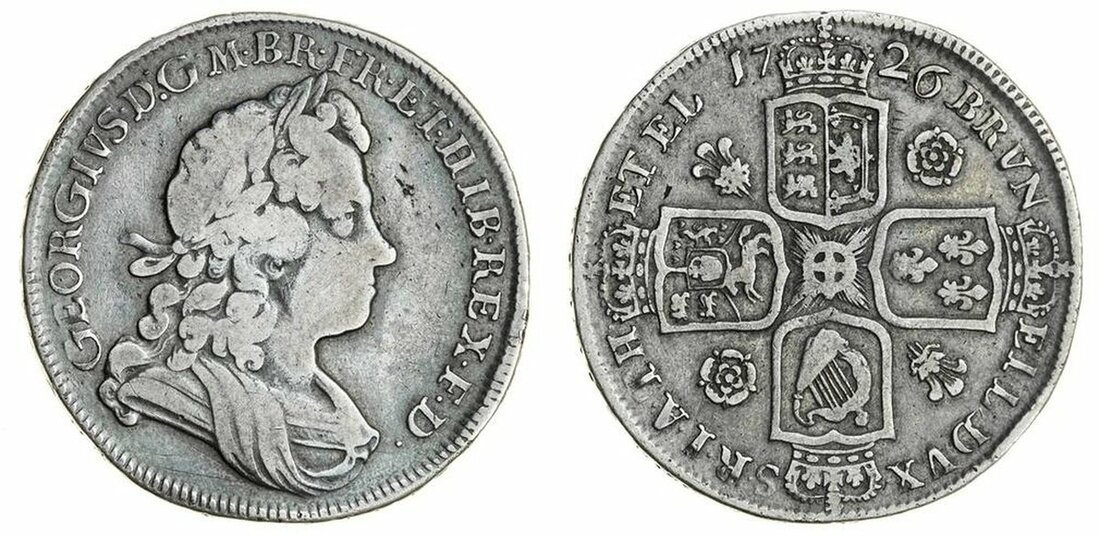 VG8 | George I (1714-1727), 'Roses and Plumes' Halfcrown, 1726 DECIMO TERTIO, laureate and draped bust right, rev. crowned shields cruciform, small roses and plumes in angles, six strings to harp (Bull 1559 [R5]; ESC 593; Spink 3644), minor flecking on obverse, fine, extremely rare, the key date of series with an excellent pedigree, in NGC 'Waterbird' holder, graded Very Good 8 (Cert. #4861777-010)