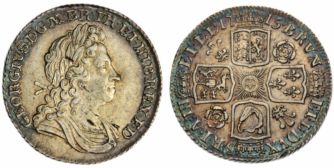 The L'Abbaye Collection | George I (1714-1727), 'Roses and Plumes' Shilling, 1715, first bust, stop after D G, rev. eight strings to harp, roses and plumes in angles, edge obliquely milled, 6.03g, 5h (Bull 1560; ESC 1162; Pywell-Phillips 267; Spink 3645), brighter surfaces with flecking and contact marks under magnification, otherwise a handsome and balanced striking further accentuated by neon blue toning to further peripheries, a really bold very fine, rare, especially in this condition