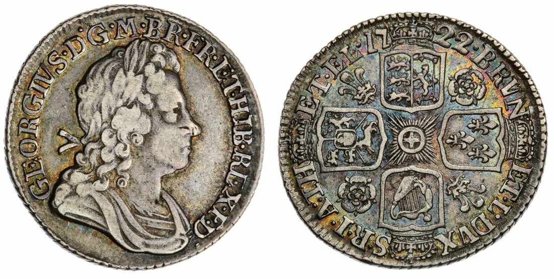 The L'Abbaye Collection | George I (1714-1727), 'Roses and Plumes' Shilling, 1722, first bust, larger lettering on obverse, rev. seven strings to harp, roses and plumes in angles, edge obliquely milled, 5.94g, 6h (Bull 1581; ESC 1174; Pywell-Phillips 274; Spink 3645), neat cabinet tone, a really good fine / near very fine, scarce