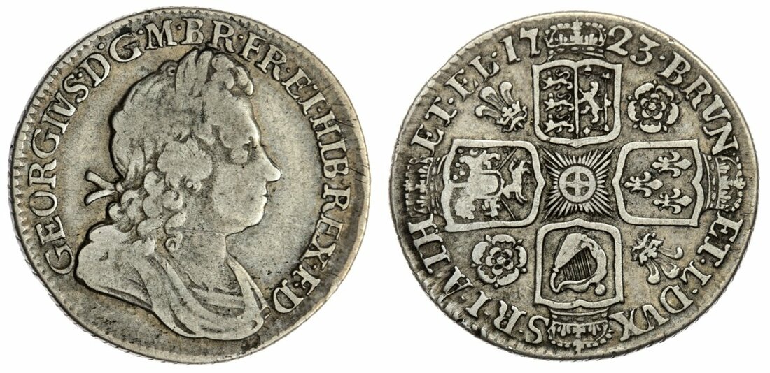 The L'Abbaye Collection | George I (1714-1727), 'Roses and Plumes' Shilling, 1723, first bust, larger lettering on obverse, rev. no colon between A TH, six strings to harp, roses and plumes in angles, edge obliquely milled, 5.88g, 6h (Bull 1584; ESC 1175; Pywell-Phillips -; Spink 3645), fine or marginally better, nonetheless the seldom encountered variety for date, especially with the first portrait, very rare thus
