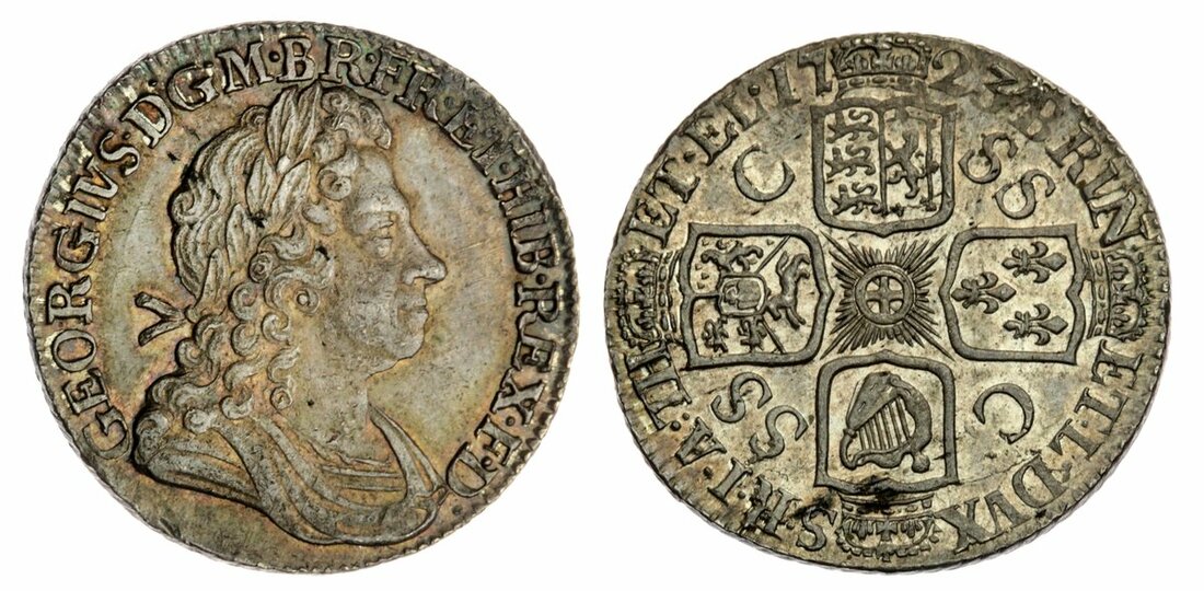 George I (1714-1727), Shilling, 1723, South Sea Company, first laureate, draped and cuirassed bust right, rev. crowned shields cruciform, seven strings to harp, SSC in angles, edge obliquely milled, 6.03g, 5h (ESC 1178; Spink 3648), lightly flecked and toned, a collectable extremely fine