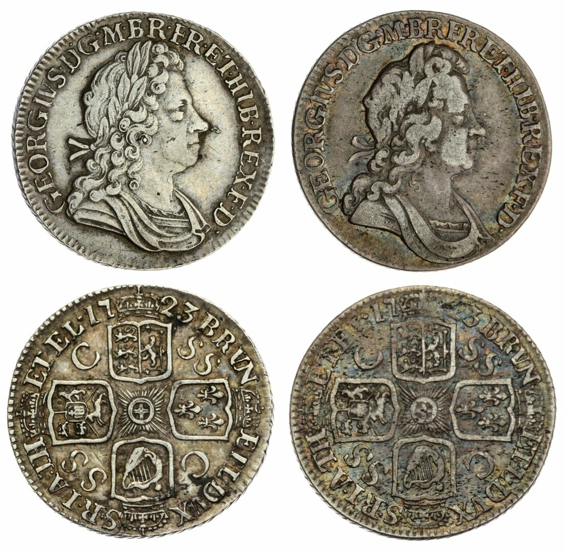 George I (1714-1727), South Sea Company, Shillings, 1723 (2), first bust, six strings to harp, 6.00g, 6h (Bull 1586; ESC 1176; Spink 3647), lightly cleaned, very fine, the reverse bolder still; another, similar, second bust, six strings to harp, 5.90g, 6h (Bull 1591 albeit six strings not listed; ESC 1178; Spink 3648), toned with some lustrous flare in recesses, fine or marginally better (2)